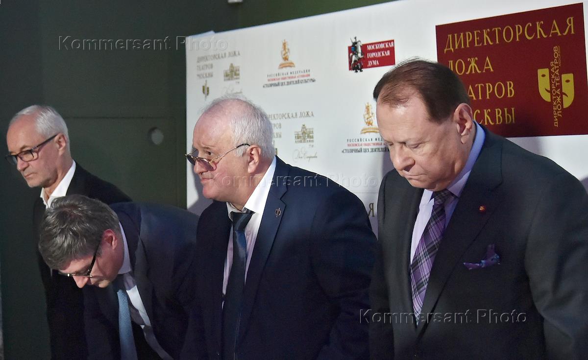 Meeting of the Moscow Theaters Directors Lodge on the its opening and on continuing the Year of Theater in Russia in the P.P. Smirnov Mansion. From left: Moscow City Duma deputy Yevgeny Gerasimov, Deputy Minister of Culture of Russia Pavel Stepanov, President of the NATSINPROEKT National Innovation Corporation Lev Latsman and Lenkom Theater's Director Mark Varshaver before the meeting.