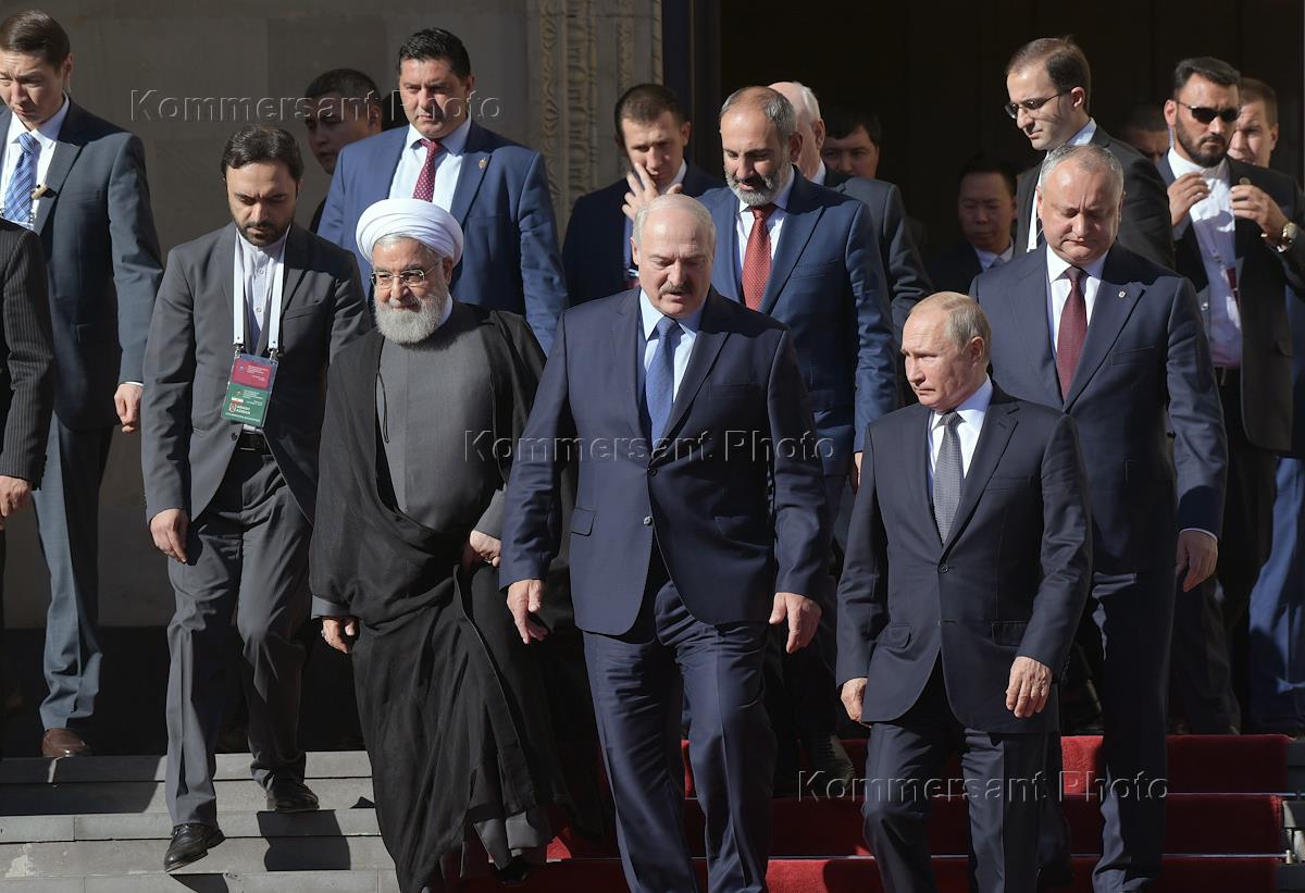 Russian President Vladimir Putin's business trip to Yerevan. Meeting of the Supreme Eurasian Economic Council and the Heads of delegations of the invited countries. Moldovan President Igor Dodon (right), Iranian President Hassan Rouhani (third from right), Belarus President Alexander Lukashenko (center) and Armenian Prime Minister Nikol Pashinyan (third from right) and Russian President Vladimir Putin (second from right) before photo-op of the Delegation Heads of the participating countries.