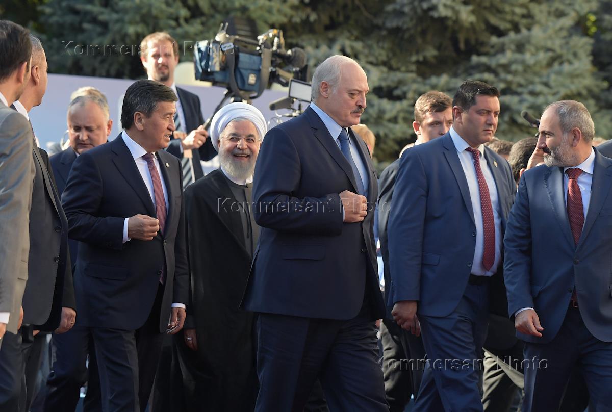 Russian President Vladimir Putin's business trip to Yerevan. Meeting of the Supreme Eurasian Economic Council and the Heads of delegations of the invited countries. Moldovan President Igor Dodon (right), Iranian President Hassan Rouhani (third from right), Belarus President Alexander Lukashenko (center) and Armenian Prime Minister Nikol Pashinyan (third from right) and Russian President Vladimir Putin (second from right) before photo-op of the Delegation Heads of the participating countries.