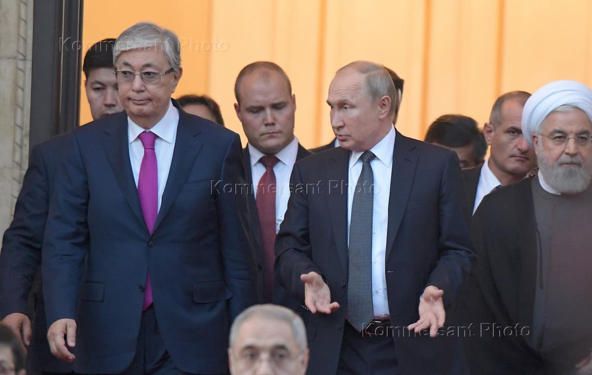 Russian President Vladimir Putin's business trip to Yerevan. Meeting of the Supreme Eurasian Economic Council and the Heads of delegations of the invited countries. Kazakh President Kassym-Jomart Tokayev (second from left), Russian President Vladimir Putin (center) and Iranian President Hassan Rouhani (right) before photo-op of the Delegation Heads of the participating countries.