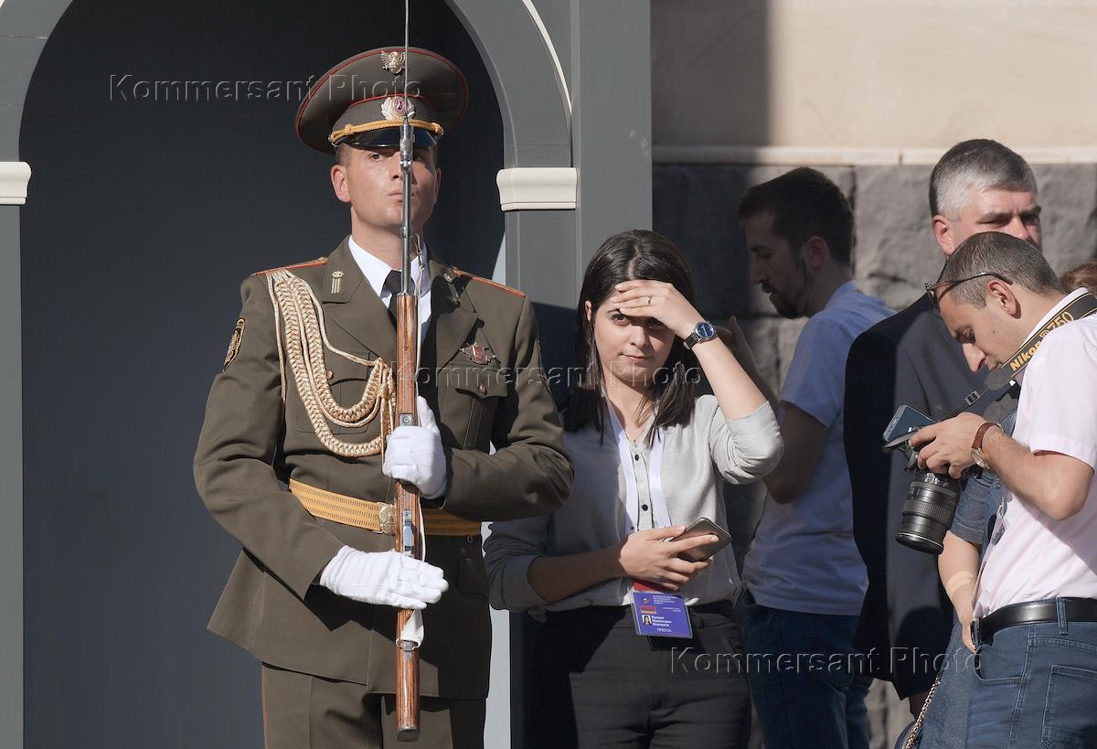 Russian President Vladimir Putin's business trip to Yerevan. Meeting of the Supreme Eurasian Economic Council and the Heads of delegations of the invited countries. Rustavi-2 TV channel journalist Mariam Menabde (right) during meeting coverage.