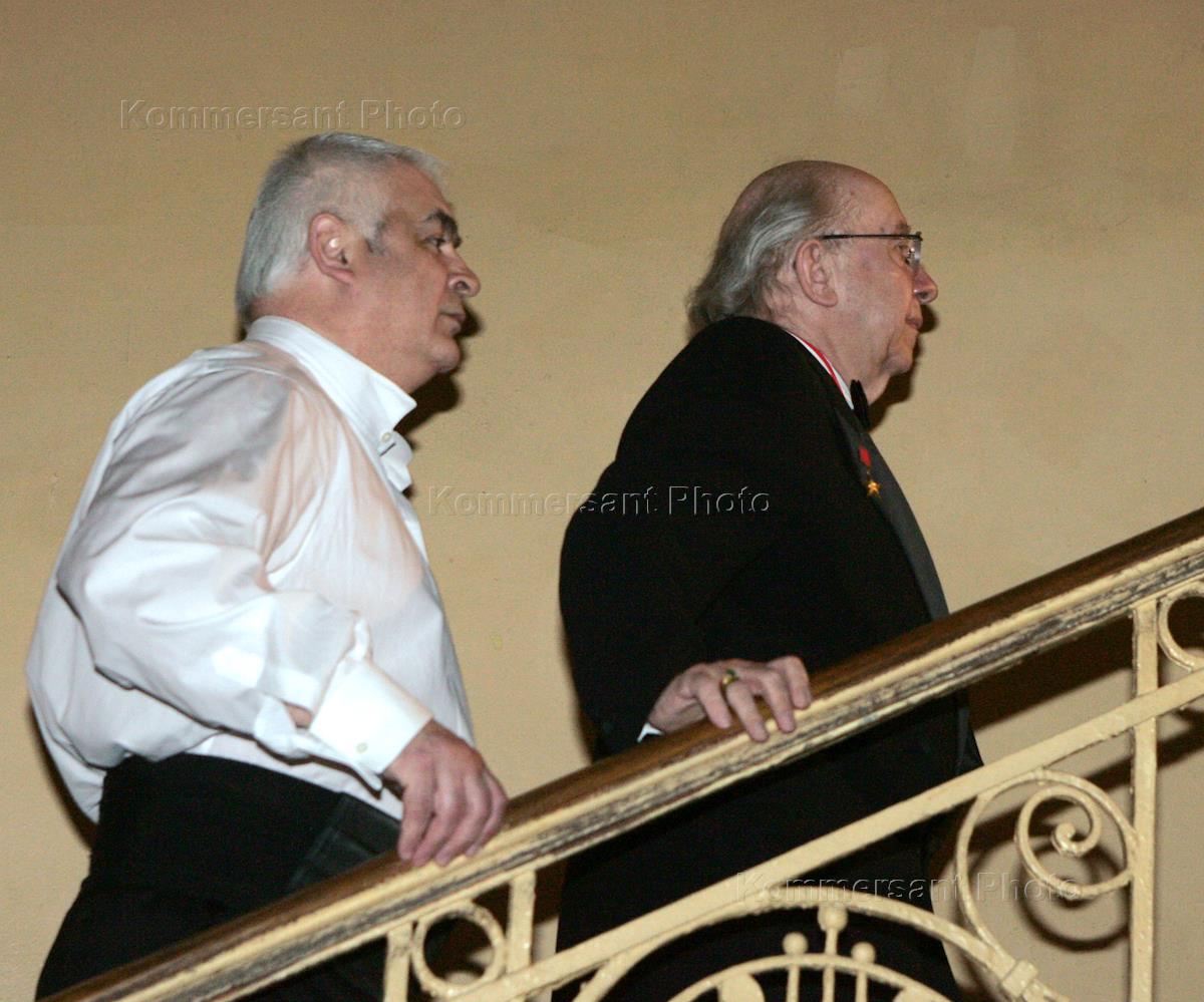 Министр культуры и массовых коммуникаций России Александр Соколов (слева) и дирижер, профессор Московской государственной консерватории имени П.И.Чайковского Геннадий Рождественский (справа) во время юбилейного концерта Геннадий Рождественского в Большом зале консерватории (БЗК).