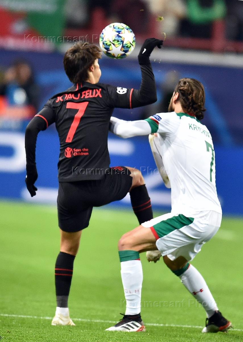 Лига Чемпионов по футболу 2019/2020. Матч между командами "Локомотив" (Москва, Россия) - "Атлетико" (Мадрид, Испания) на стадионе "РЖД Арена". Игрок команды "Локомотив" Гжегож Крыховяк (справа) и игрок команды "Атлетико" Жоау Фелиш (слева) во время матча.