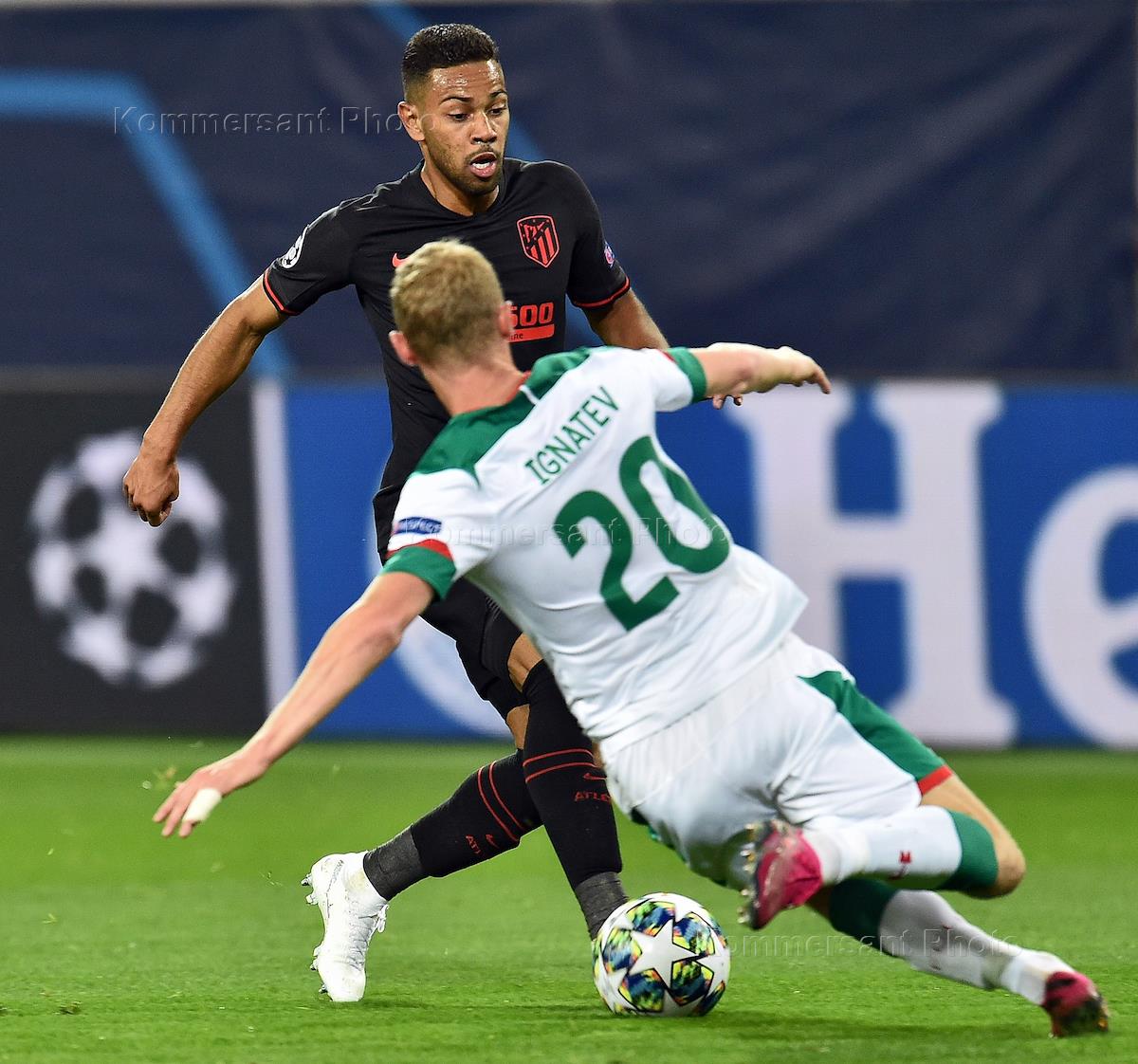 Лига Чемпионов по футболу 2019/2020. Матч между командами "Локомотив" (Москва, Россия) - "Атлетико" (Мадрид, Испания) на стадионе "РЖД Арена". Игрок команды "Локомотив" Владислав Игнатьев (в центре) и игрок команды "Атлетико" Ренан Лоди (слева) во время матча.