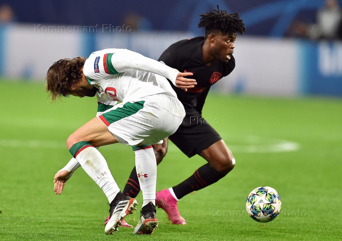 The 2019/20 UEFA Champions League. Match between Lokomotiv (Moscow, Russia) and Atletico (Madrid, Spain) at the Russian Railways Arena stadium. Atletico's Thomas Partey, right, and Lokomotiv's Grzegorz Krychowiak, left, during the match.