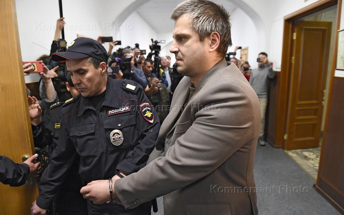 St. Petersburg resident Sergey Grigoryev, right, accused of murder of The Investigative Committee central office employee Vladislav Kapustin, before a hearing in the Basmanny district court.
