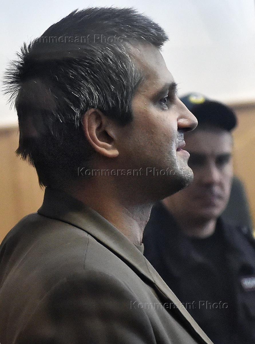 St. Petersburg resident Sergey Grigoryev, center, accused of murder of The Investigative Committee central office employee Vladislav Kapustin, attends a hearing in the Basmanny district court.