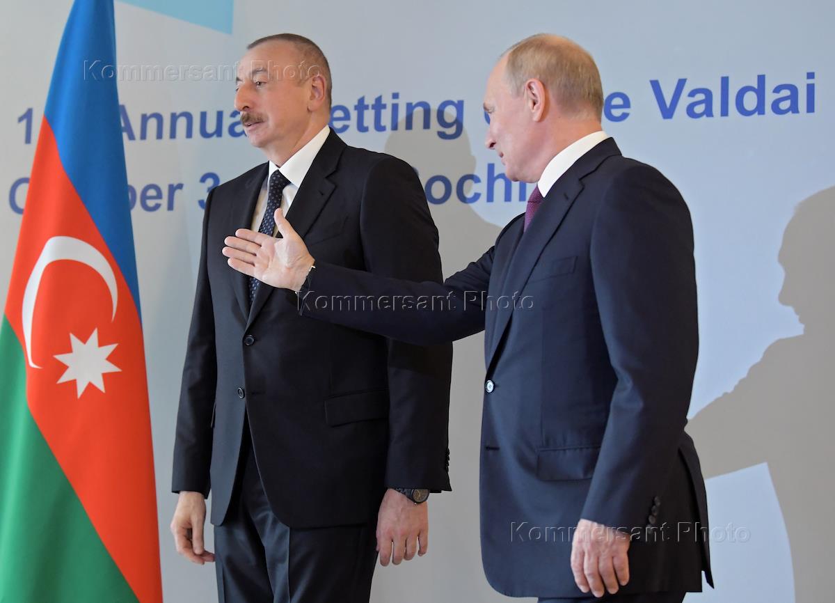 Рабочая поездка президента России Владимира Путина в Сочи. Заседание Валдайского клуба. Президент Азербайджана Ильхам Алиев (слева) и президент России Владимир Путин (справа) во время встречи в гостиничном комплексе "Поляна. 1389".