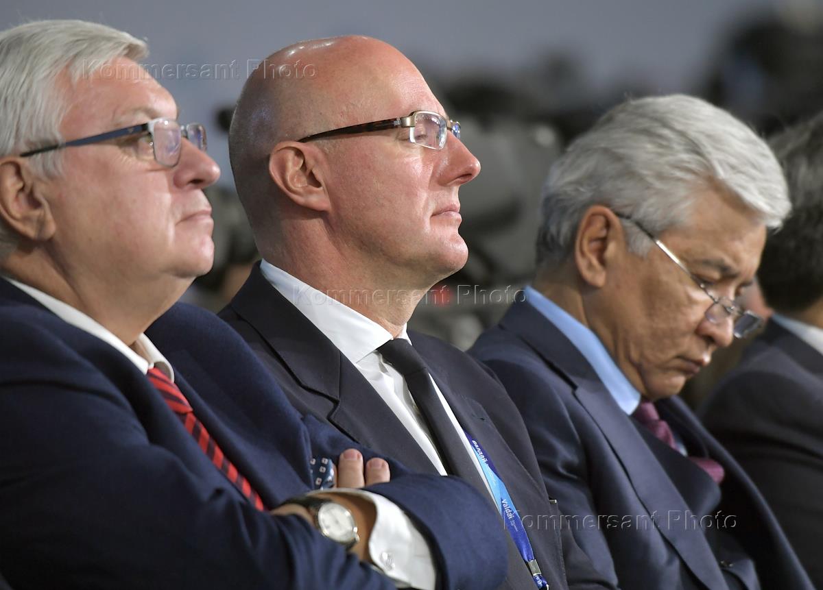 Рабочая поездка президента России Владимира Путина в Сочи. XVI Ежегодное заседание клуба "Валдай". Председатель правления АО "Газпром-Медиа Холдинг" Дмитрий Чернышенко (в центре) и ректор МГИМО Анатолий Торкунов (слева) на пленарной сессии "Мировое устройство: взгляд с Востока" в гостиничном комплексе "Поляна. 1389".