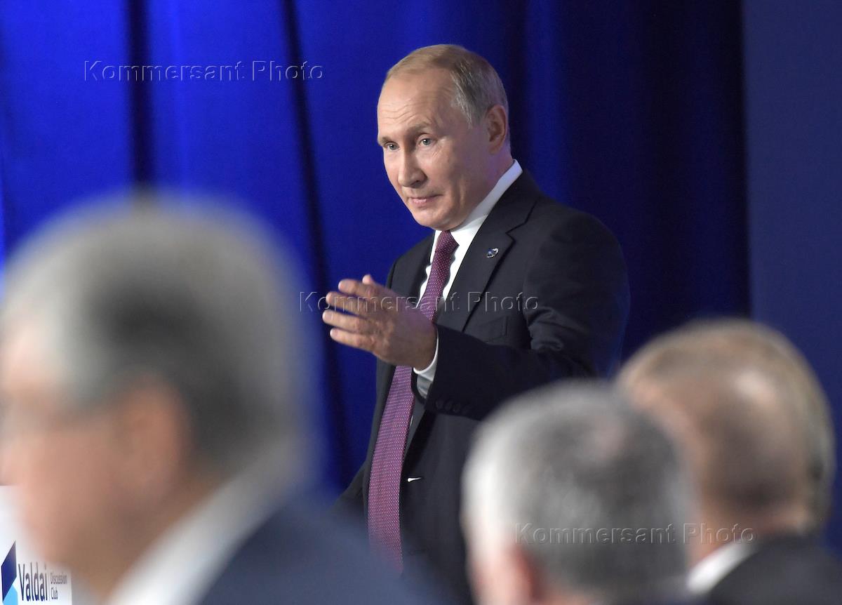Рабочая поездка президента России Владимира Путина в Сочи. Заседание Валдайского клуба. Президент России Владимир Путин во время пленарной сессии на тему "Мировое устройство: взгляд с Востока" в гостиничном комплексе "Поляна. 1389".