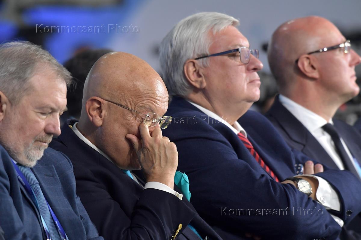Russian President Vladimir Putin's business trip to Sochi. Valdai Discussion Club meeting. From right: Director General of the Russian Direct Investment Fund Kirill Dmitriev, MGIMO University Rector Anatoly Torkunov and Dean of the Faculty of World Economy and International Affairs at the National Research University Higher School of Economics, Chairman of the Presidium of the Council for Foreign and Defence Policy Sergey Karaganov during the “World order: point of view of the East” plenary session at the Glade 1389 hotel complex.