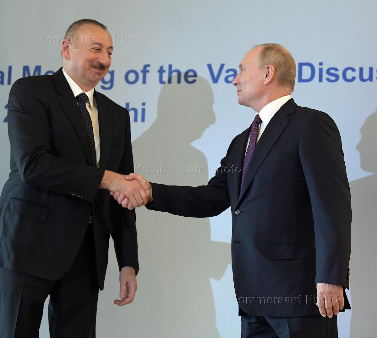 Рабочая поездка президента России Владимира Путина в Сочи. Заседание Валдайского клуба. Президент Азербайджана Ильхам Алиев (слева) и президент России Владимир Путин (справа) во время встречи в гостиничном комплексе "Поляна. 1389".
