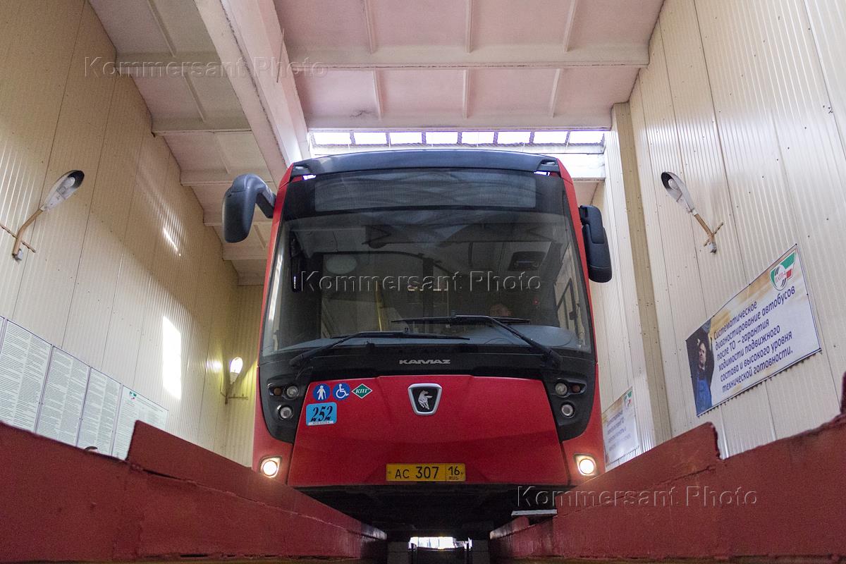 Press tour at the Kazan's Municipal Unitary Public Transport Enterprise No. 4 related to the preparation of municipal passenger transport for the autumn-winter period. Bus during diagnostics.