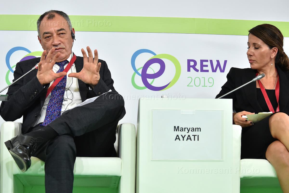 Russian Energy Week at the Manezh Central Exhibition Hall. Day 2. Global Markets consultant George Montepek and Head of the Business Development and Investment Division of Shell Trading, Chairman of the Board of Founders of Vakt Holdings, Maryam Ayati (right) during the "The evolution of world benchmarks: new trends in pricing on international oil markets" session.