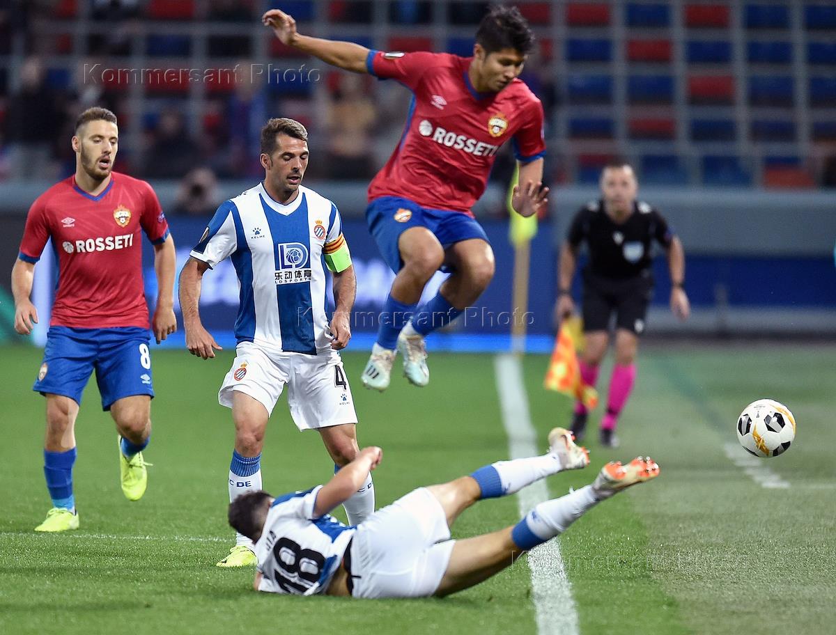 The 2019/20 UEFA Champions League. Match between CSKA (Russia, Moscow) and Espanyol (Spain, Barcelona) at the VEB Arena stadium. CSKA's Fyodor Chalov, left, and Espanyol's David Lopez, second from left, during the match.