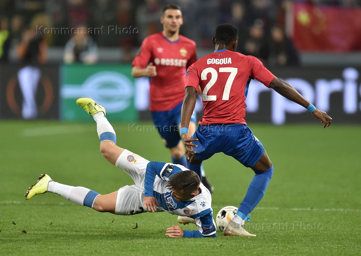The 2019/20 UEFA Champions League. Match between CSKA (Russia, Moscow) and Espanyol (Spain, Barcelona) at the VEB Arena stadium. CSKA's Cedric Gogoua, right, and Espanyol's Viktor Kampusano, center, during the match.