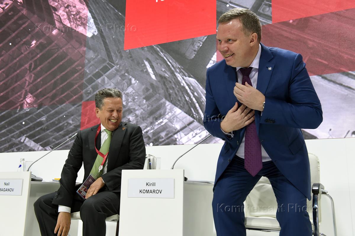 Russian Energy Week 2019 Forum at the Manezh Central Exhibition Hall. General Director of TATNEFT named after VD Shashin Nail Maganov (left) and First Deputy General Director, Director of Development and International Business of Rosatom State Atomic Energy Corporation Kirill Komarov (right) at the panel session "Prospects for cooperation between the fuel and energy enterprises and the defenсe industry for the purposes of import substitution and technological development."