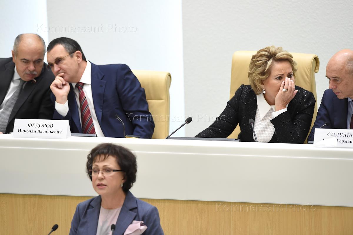 Парламентские слушания "О параметрах проекта федерального бюджета на 2020 год и на плановый период 2021 и 2022 годов" в Совете Федерации (СФ) России. Слева направо: заместитель председателя СФ России Ильяс Умаханов, первый заместитель председателя СФ России Николай Федоров, заместитель председателя Счетной палаты России Галина Изотова, председатель СФ России Валентина Матвиенко и первый заместитель председателя правительства - министр финансов России Антон Силуанов во время слушаний.
