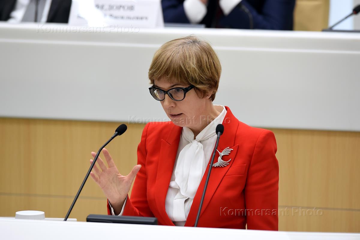Парламентские слушания "О параметрах проекта федерального бюджета на 2020 год и на плановый период 2021 и 2022 годов" в Совете Федерации (СФ) России. Первый заместитель председателя Центрального Банка России Ксения Юдаева во время выступления на слушаниях.