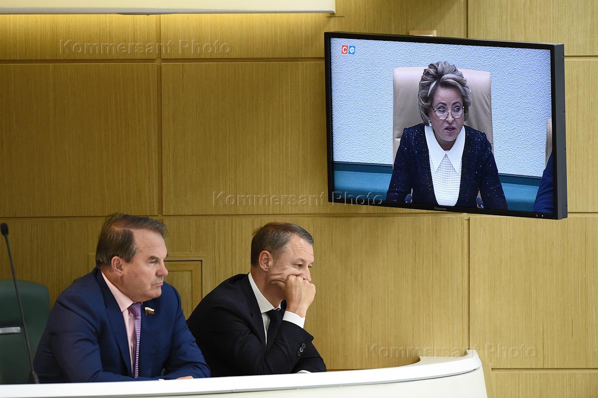 Парламентские слушания "О параметрах проекта федерального бюджета на 2020 год и на плановый период 2021 и 2022 годов" в Совете Федерации (СФ) России. Первый заместитель председателя СФ России Николай Федоров (слева) и председатель СФ России Валентина Матвиенко (справа) во время слушаний.