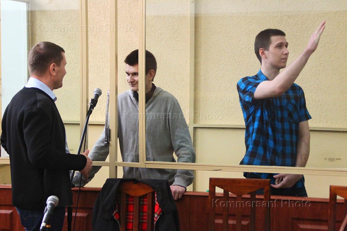 The defendants in the "Telegram Revolution" case Vladislav Mordasov (second from right), Yan Sidorov (left) during sentencing in the Rostov Regional Court.