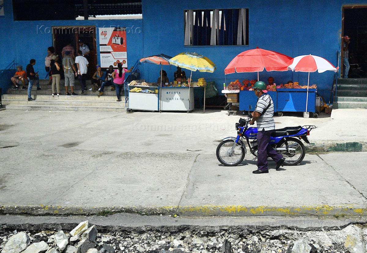 Views of Havana. A man with a bicycle near stalls of street fruit vendors.