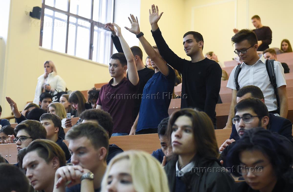 Лекция лидера партии ЛДПР Владимира Жириновского студентам-политологам в Московском государственном университете (МГУ) имени Ломоносова. Студенты во время лекции.