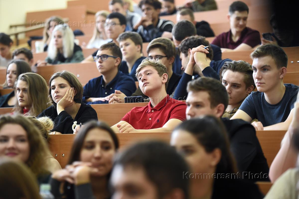 Lecture by LDPR leader Vladimir Zhirinovsky to political science students at Moscow State University. Students during the lecture.