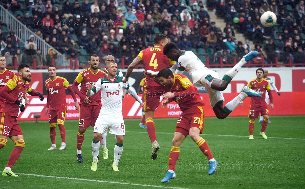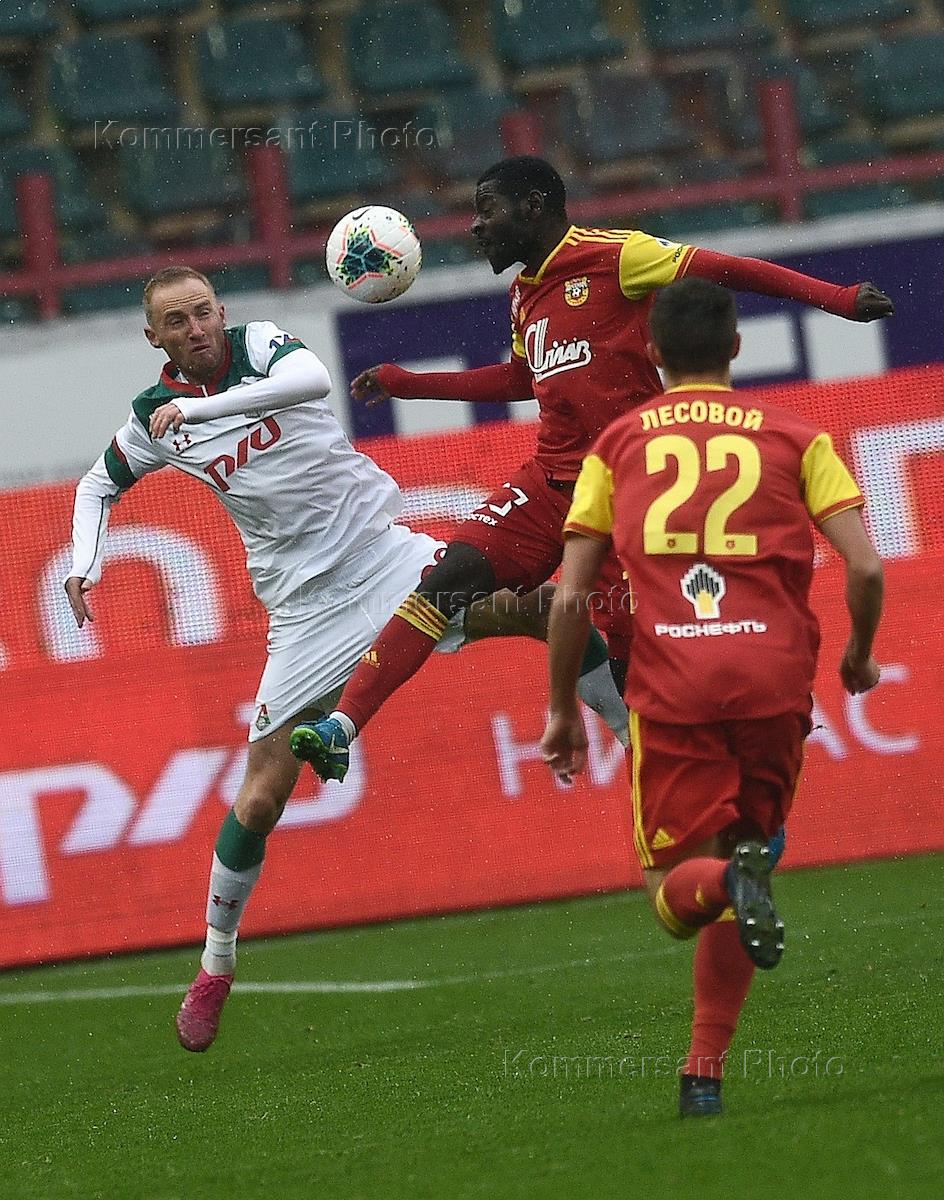 Российская Премьер-лига (РПЛ). Чемпионат России по футболу 2019/2020. 12-й тур. Матч между командами "Локомотив" (Москва) и "Арсенал" (Тула) на стадионе "РЖД Арена". Игрок команды "Локомотив" Владислав Игнатьев (слева) и игрок команды "Арсенал" Эванс Кангва (в центре) во время матча.