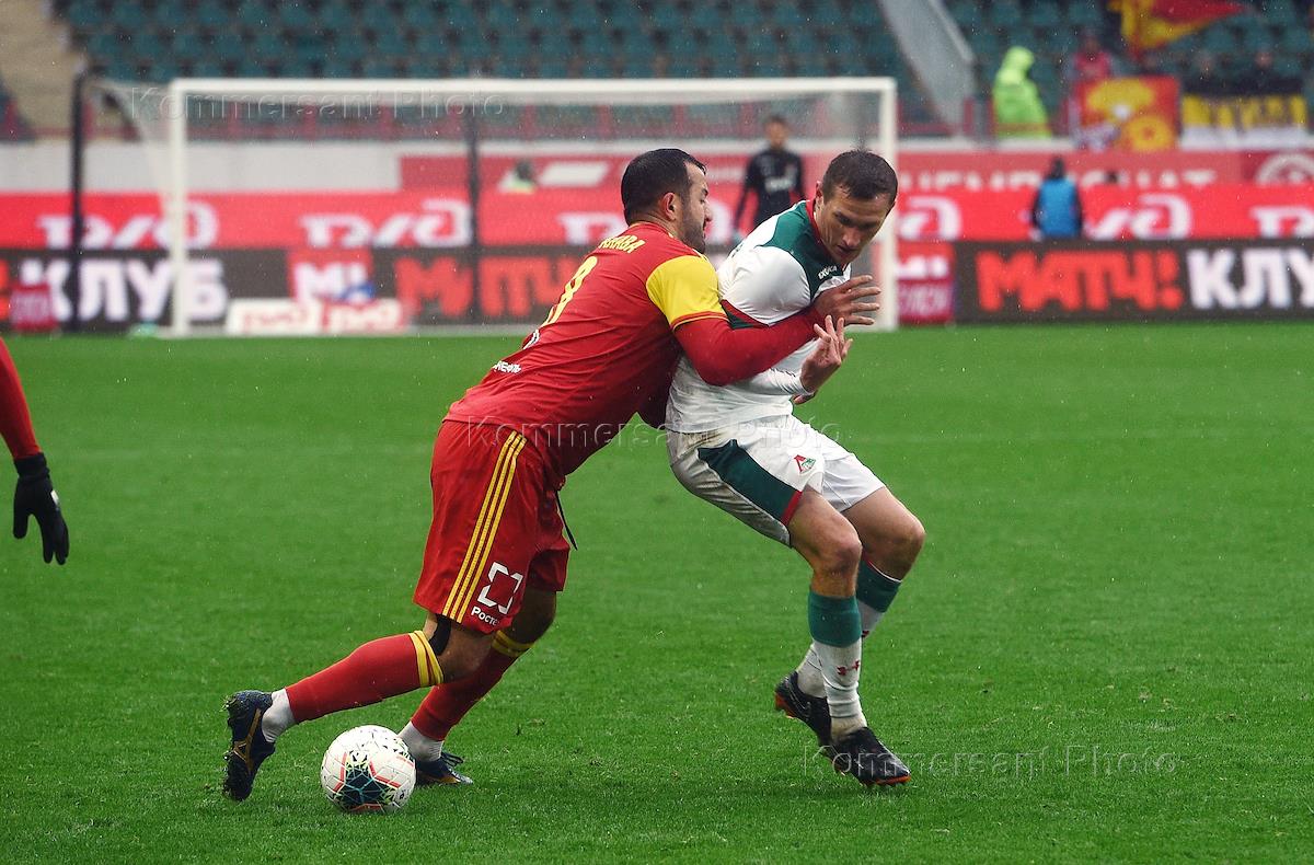 Российская Премьер-лига (РПЛ). Чемпионат России по футболу 2019/2020. 12-й тур. Матч между командами "Локомотив" (Москва) и "Арсенал" (Тула) на стадионе "РЖД Арена". Игрок команды "Локомотив" Александр Коломейцев (справа) и игрок команды "Арсенал" Гиа Григалава (слева) во время матча.