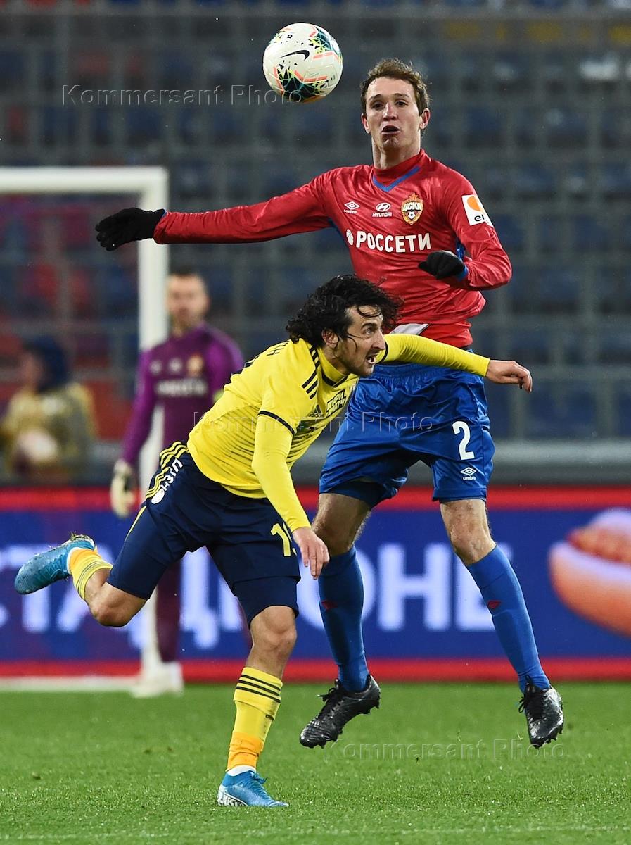 Russian Premier League (RPL). Russian Football Championship 2019/2020. Matchday 12. Match between CSKA (Moscow) and Rostov (Rostov-on-Don) at the VEB Arena stadium. Rostov's Khoren Bayramyan, left, and CSKA's Mario Fernandes, right, during the match.