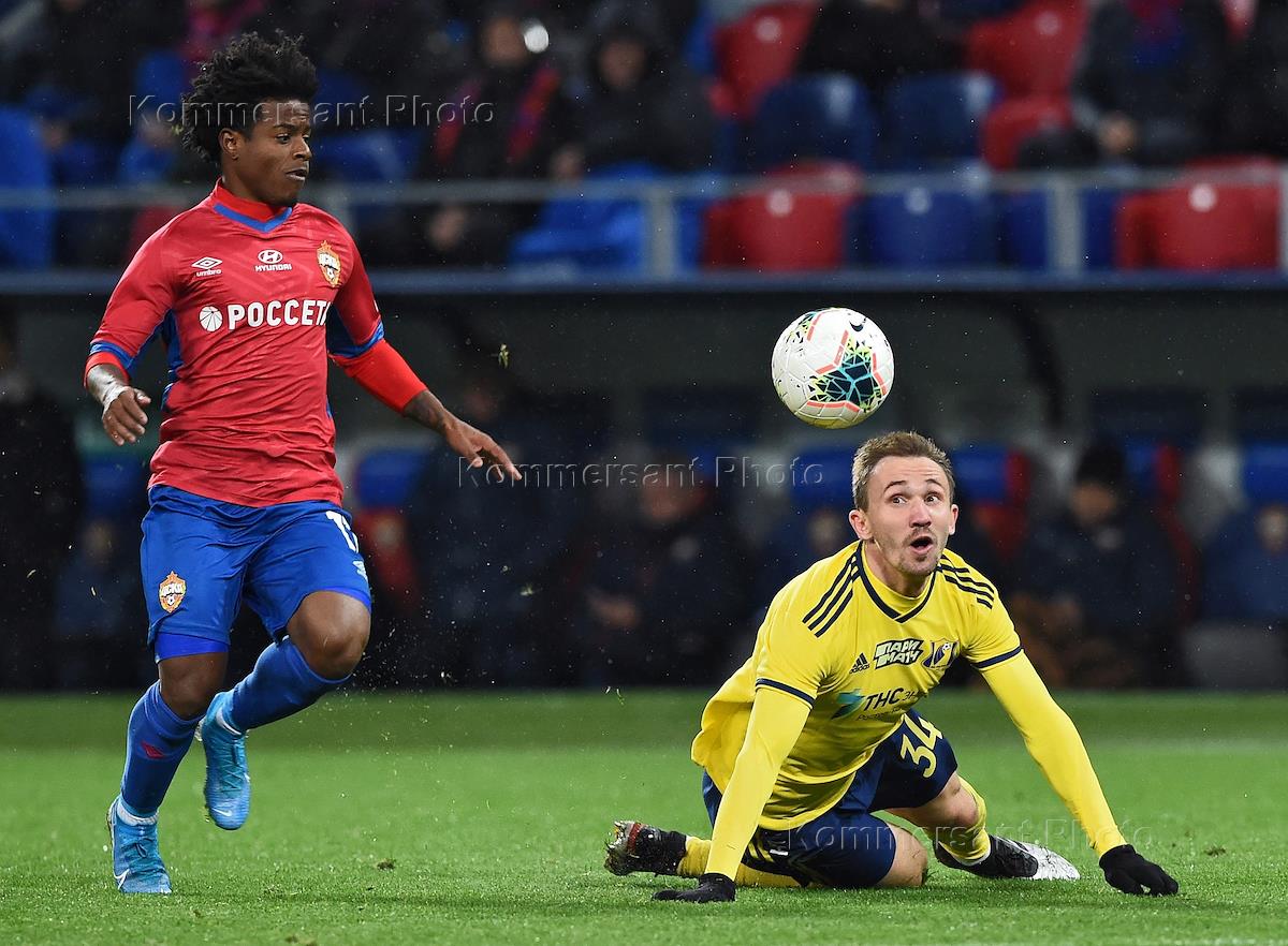 Russian Premier League (RPL). Russian Football Championship 2019/2020. Matchday 12. Match between CSKA (Moscow) and Rostov (Rostov-on-Don) at the VEB Arena stadium. Rostov's Aleksey Kozlov, right, and CSKA's Lucas Santos, left, during the match.
