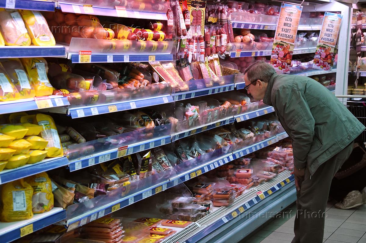 Genre photo. Customers in store. Food displays. Freezing chamber in a dairy section.