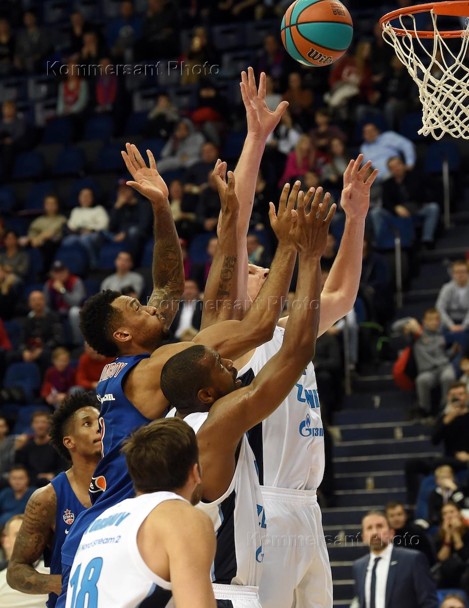 VTB United League. Match between CSKA (Moscow) and Zenit (St. Petersburg) at Universal Sports Hall CSKA. Zenit's Will Thomas, left, and CSKA's Andrey Vorontsevich, right, during the match.