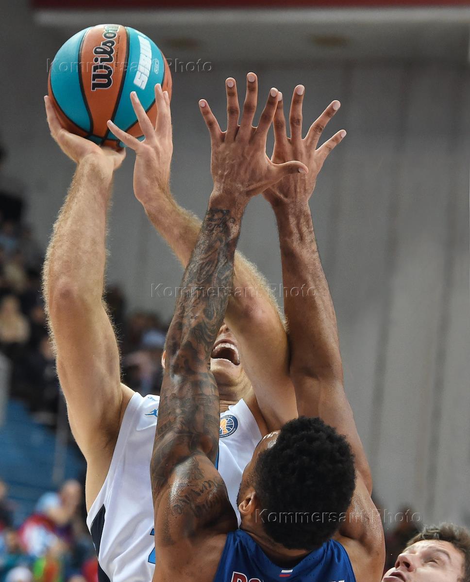 Единая лига ВТБ по баскетболу. Матч между командами ЦСКА (Москва) - "Зенит" (Санкт-Петербург) в Универсальном спортивном комплексе ЦСКА. Игрок команды "Зенит" Остин Холлинз (справа) и игрок команды ЦСКА Йоханнес Фогтманн (слева) во время матча.