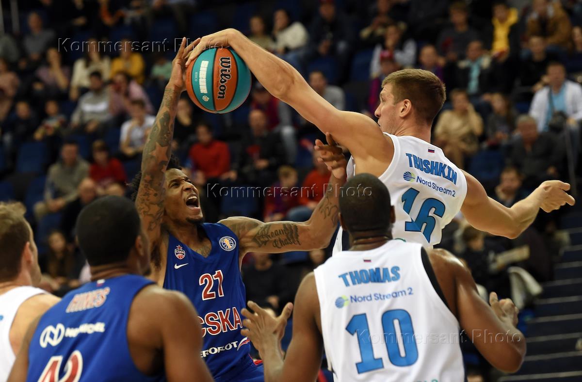 VTB United League. Match between CSKA (Moscow) and Zenit (St. Petersburg) at Universal Sports Hall CSKA. Zenit's Will Thomas, left, and CSKA's Andrey Vorontsevich, right, during the match.