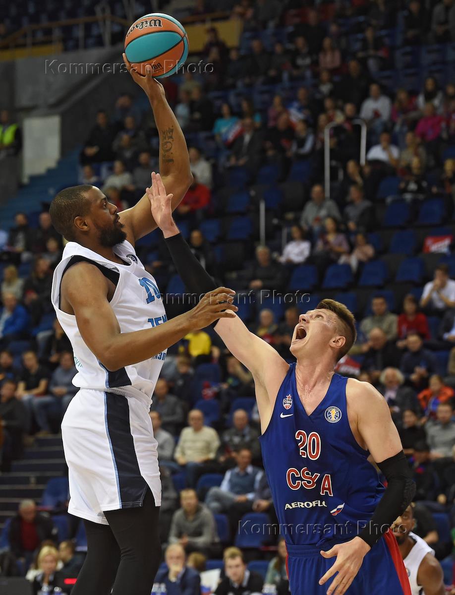 Единая лига ВТБ по баскетболу. Матч между командами ЦСКА (Москва) - "Зенит" (Санкт-Петербург) в Универсальном спортивном комплексе ЦСКА. Игрок команды "Зенит" Уилл Томас (слева) и игрок команды ЦСКА Андрей Воронцевич (справа) во время матча.