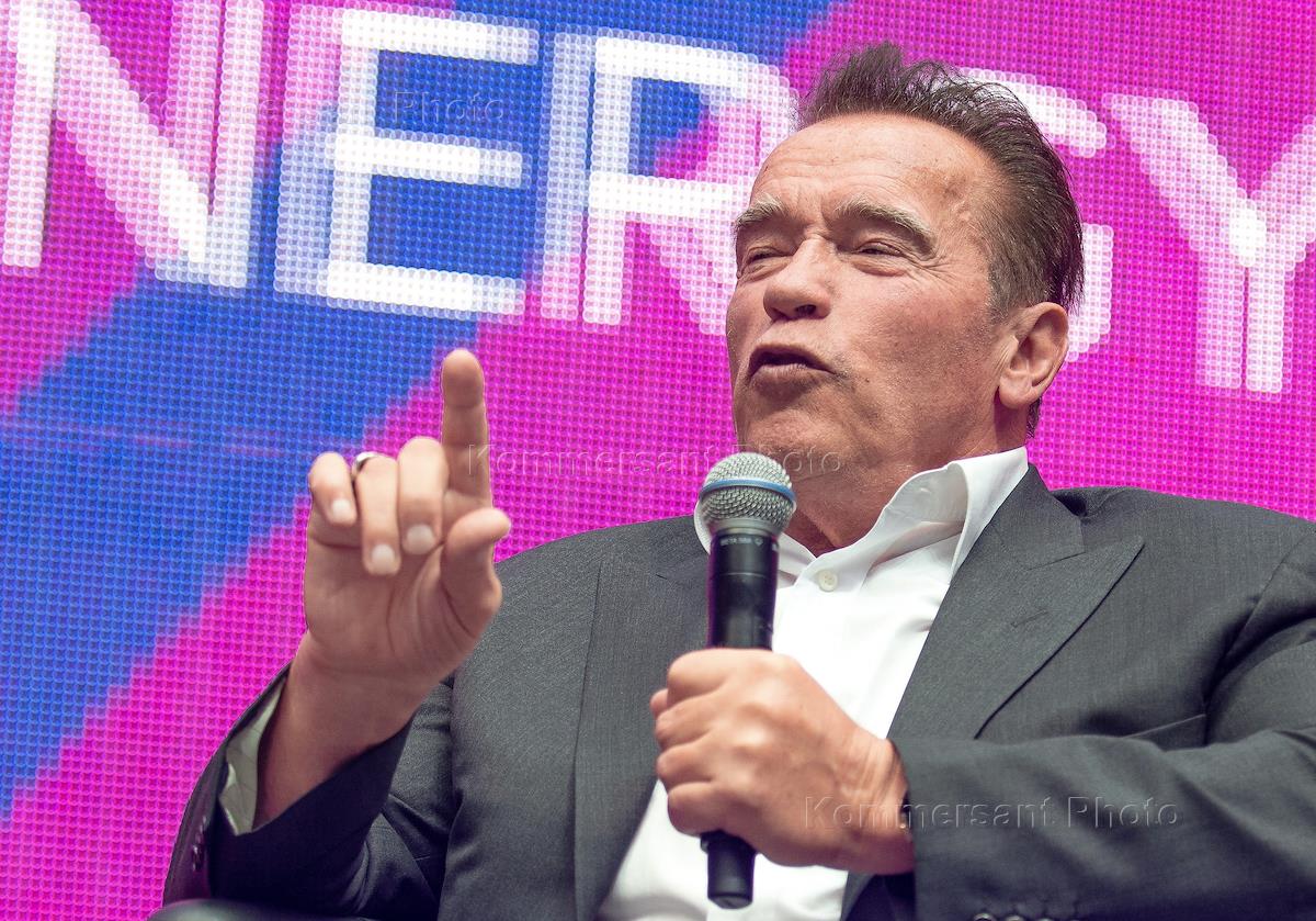 Synergy Global Forum. Actor, Former Governor of California Arnold Schwarzenegger, right, delivers a speech at the forum.