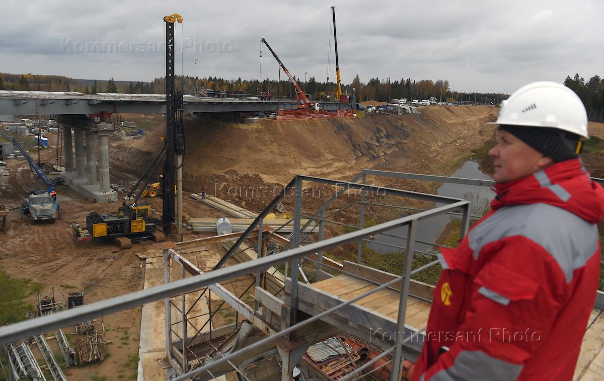 Инспекция третьего пускового комплекса Центральной кольцевой автомобильной дороги (ЦКАД). Рабочий на стройке.
