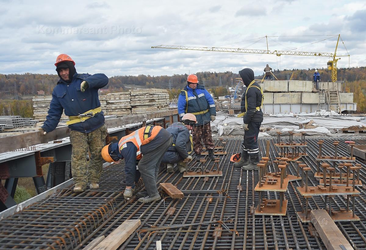Инспекция третьего пускового комплекса Центральной кольцевой автомобильной дороги (ЦКАД). Рабочие во время строительства моста.