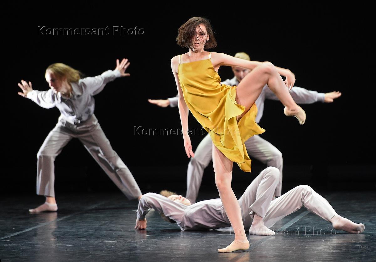 Пресс-показ Вечера молодых хореографов - 2019 в рамках фестиваля Context. Diana Vishneva на сцене "Гоголь-центра". Солистка студии современного танца JazzMix (Пермь) Марина Кремнёва (в центре) во время исполнения балета в своей постановке "Под давлением/Under Pressure".