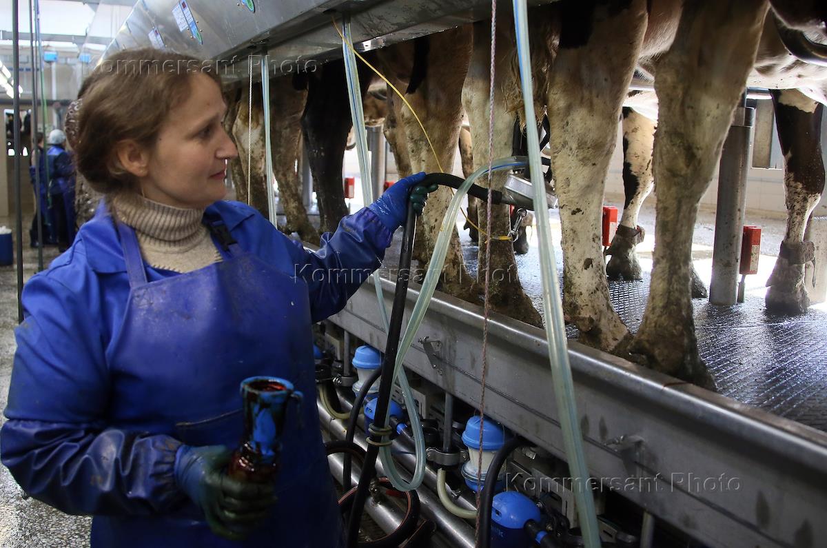 Agricultural enterprises of the STEPPE Agroholding. Сommercial dairy farm in Pavlovsky district. Preparing cows for milking.