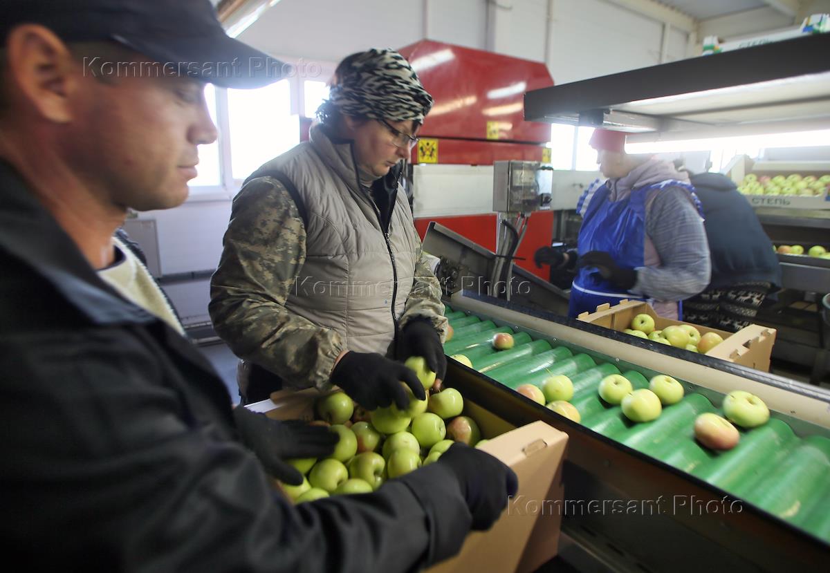 Agricultural enterprises of the STEPPE Agroholding. Harvesting in intensive apple orchards in the Leningrad region.