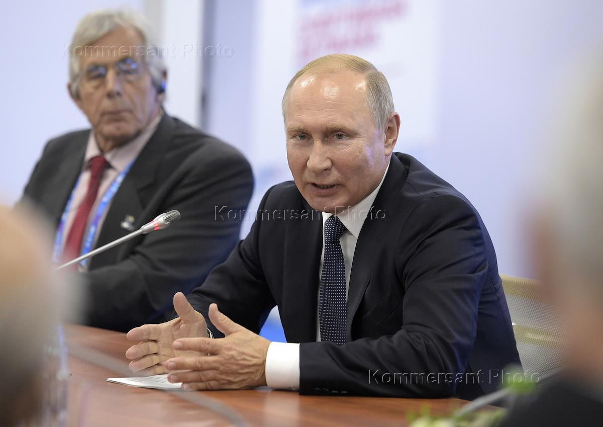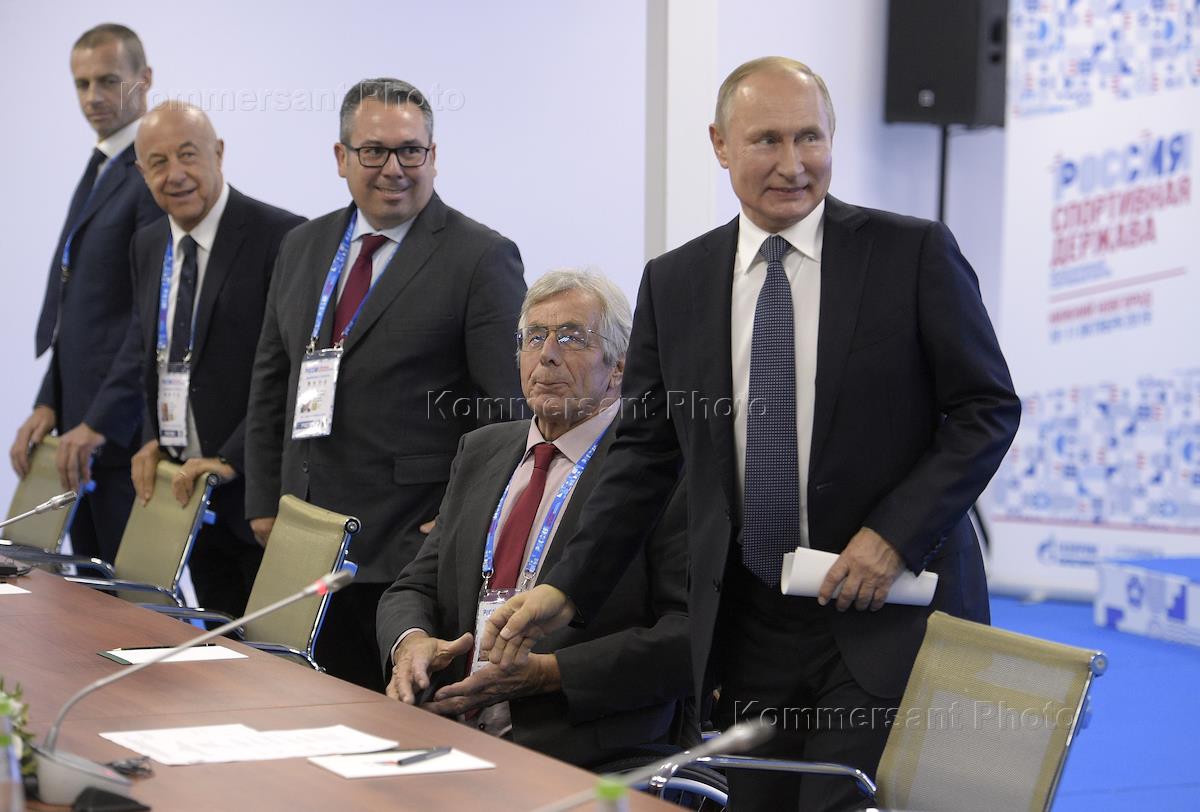 Рабочая поездка президента России Владимира Путина в Нижний Новгород. VIII Международный форум "Россия - Спортивная держава" на территории стадиона "Нижний Новгород". Президент России Владимир Путин (справа) во время встречи с главами международных спортивных организаций.