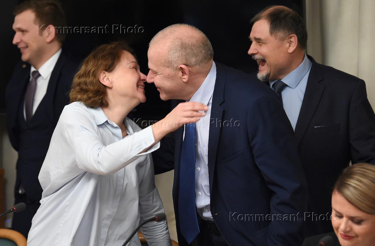 An expanded meeting of the Committee of the State Duma Committee on Informational Policy, Technologies and Communications on "Regulation of Internet resources that occupy a dominant position in the information space." Chairman of the State Duma Committee on Informational Policy, Technologies and Communications Leonid Levin (center), Head of Roskomnadzor Legal Department Maria Smelyanskaya (second from right) and Head of Rospotrebnadzor Consumer Rights Protection Department Oleg Prusakov (right) before the meeting.