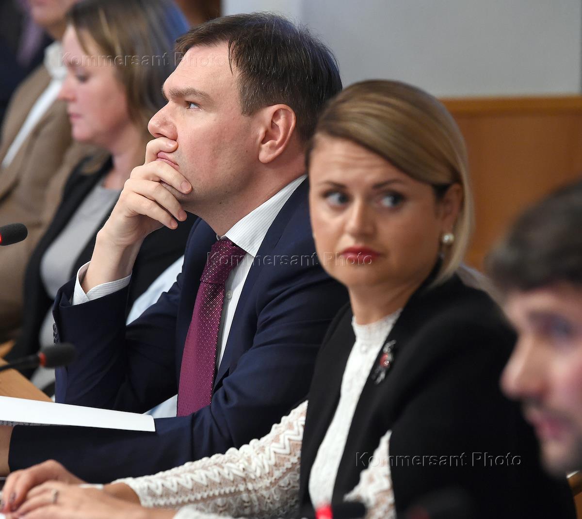 Расширенное заседание комитета Государственной думы России по информационной политике, информационным технологиям и связи на тему "Регулирование интернет-ресурсов, занимающих доминирующее положение в информационном пространстве". Начальник правового управления Роскомнадзора Мария Смелянская (слева) и начальник управления защиты прав потребителей Роспотребнадзора Олег Прусаков (справа) перед началом заседания.