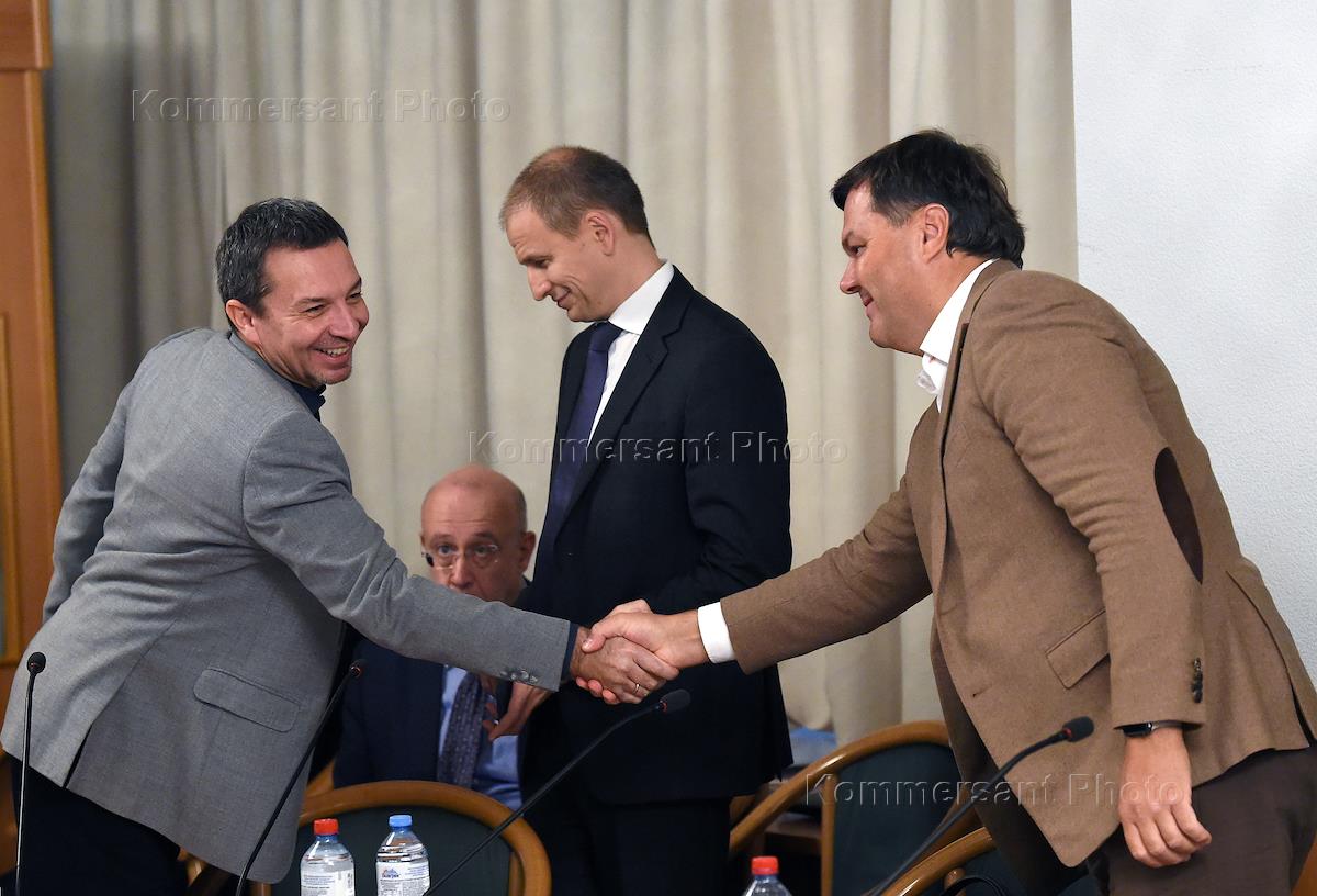 Расширенное заседание комитета Государственной думы России по информационной политике, информационным технологиям и связи на тему "Регулирование интернет-ресурсов, занимающих доминирующее положение в информационном пространстве". Заместитель начальника Центра информационной безопасности (ЦИБ) ФСБ России Николай Мурашов (слева) и управляющий партнер компании "Ашманов и партнеры" Игорь Ашманов (второй справа) перед началом заседания.