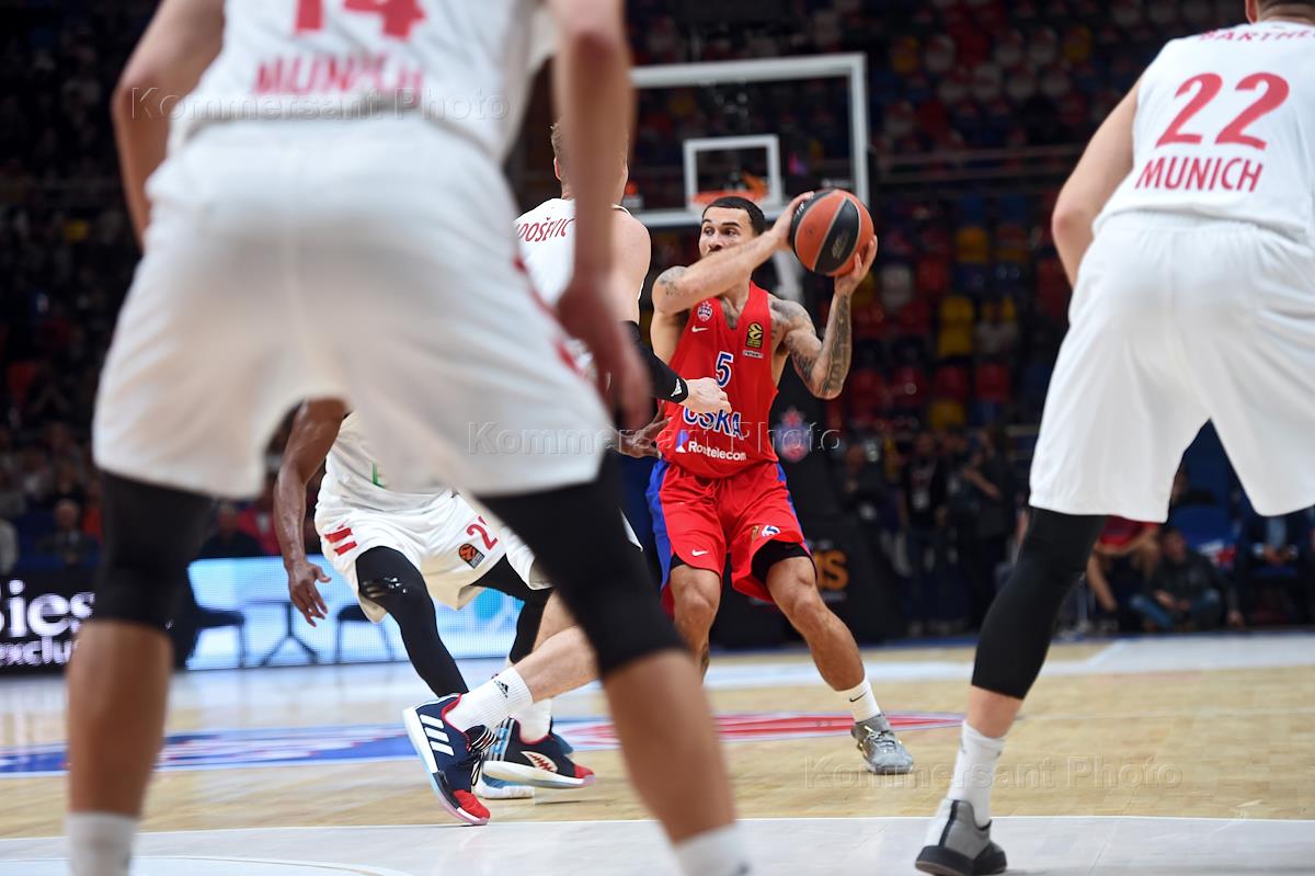 Евролига по баскетболу 2019/2020. 2-й тур. Матч между командами ЦСКА (Россия, Москва) и "Бавария" (Германия, Мюнхен) на арене "Мегаспорт". Игрок команды ЦСКА Кайл Хайнс (в центре) во время матча.