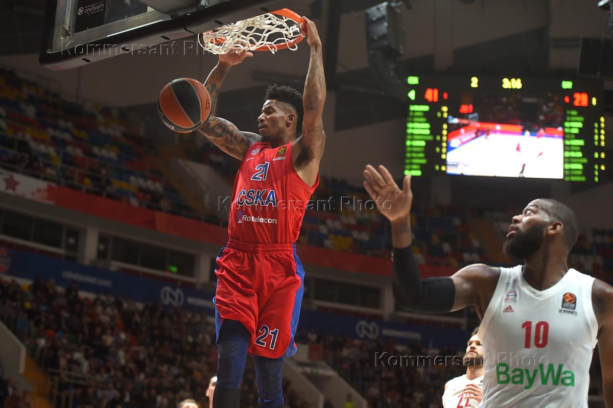 Евролига по баскетболу 2019/2020. 2-й тур. Матч между командами ЦСКА (Россия, Москва) и "Бавария" (Германия, Мюнхен) на арене "Мегаспорт". Игрок команды ЦСКА Кайл Хайнс (в центре) во время матча.