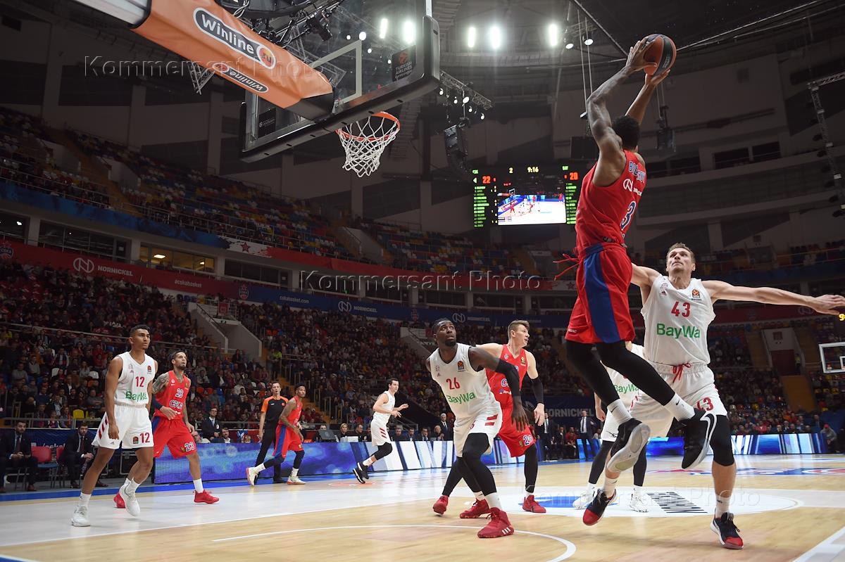 Евролига по баскетболу 2019/2020. 2-й тур. Матч между командами ЦСКА (Россия, Москва) и "Бавария" (Германия, Мюнхен) на арене "Мегаспорт". Игрок команды ЦСКА Уилл Клайберн (второй справа) во время матча.